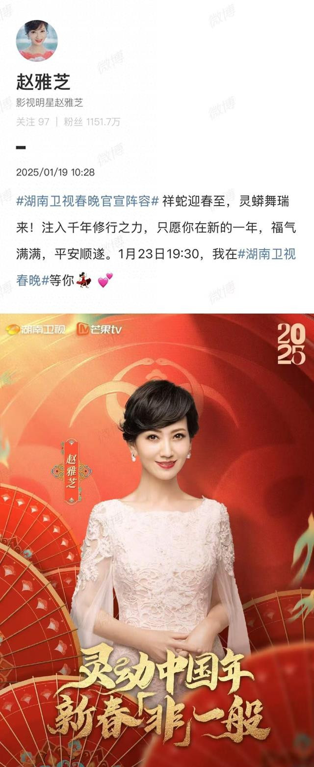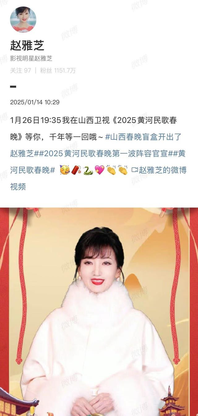 赵雅芝本人也在微博上接连发布了多条消息,宣布自己将登上多个卫视的春晚舞台。