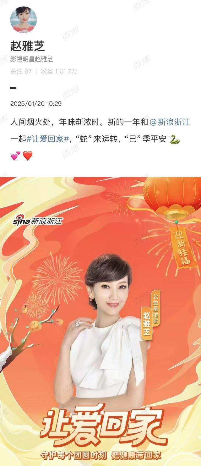 20日上午,赵雅芝在社交媒体上给网友们送上了新年祝福:“人间烟火处,年味渐浓时。